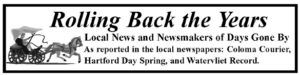 90 years ago – 1929 The first improvement made in what is now the City of Watervliet was the sawmill at the mouth of Mill Creek, which was built by Sumner & Wheeler in 1833. After completing the mill they hired two brothers named VanDusen to run it. The VanDusen brothers lived in a shanty built of slabs and were undoubtedly the first white settlers at Watervliet. There was a family gathering at the A.J. Clark home in honor of Mrs. Clark’s father, A.J. Kelly, who celebrated his 82nd birthday on Nov. 28, 1929. Isaac Moffat put up the first storefront building which stood sideways north of the Odd Fellow Hall. In 1862 or 1863 it was moved south, placed endways and converted into a dwelling house. 60 years ago – 1959 Claude A. Wigent, who entered the armed forces in April 1959 and took basic training at Fort Ord, CA, is now in Aughburg, Germany. Mr. and Mrs. Ralph Johnson are the proud parents of their baby boy, Kevin Wayne, born Nov. 10, 1959. Arthur W. Helweg was among the 33 students in Miami University’s School of Education recently made members of the Miami Chapter of Kappa Phi Kappa. Arthur is a second year student at Miami University, majoring in education under an N.R.O.T.C. scholarship. 30 years ago – 1989 Danny Iliff has been chosen Watervliet South Elementary School’s “Student of the Week”. Danny is a first-grader and an exceptional student, talented in many areas. For the second year, there will be a downhill ski club in Watervliet for students in grades 6 – 12. Ski trips will be to Bittersweet Ski Area near Otsego. Watervliet Public Schools Employee of the Month for October 1989 is Rosemary Smith, teacher aide in the Adjusted Studies classroom at South School. Rosemary started work in the fall of 1976 helping in the kitchen and lunch room at the high school. The following year she became a teacher aide. She has had a great impact on many special education students over the years. Submitted by Sally Q. Gonzalez from files at Watervliet District Library of the Watervliet Record newspapers donated by the Tri-City Record. Hours: Mon & Wed, 10 a.m.-8 p.m.; Tue, Thur & Fri, 10 a.m.-5 p.m.; Sat, 9 a.m.-3 p.m. Phone: 269-463-6382